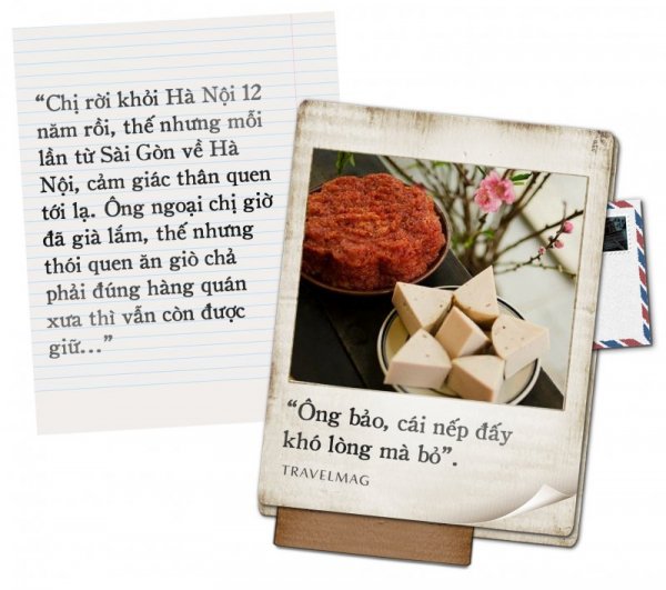 Mỗi lần chị rời Hà Nội trở lại Sài Gòn đều đem theo cơ man đồ ăn. Những thứ như giò lụa, chả quế, chả cốm luôn không thiếu trong chiếc thùng mẹ gửi kèm. Mỗi lần ăn những món này, hơi thở Hà Nội lại ùa về”.