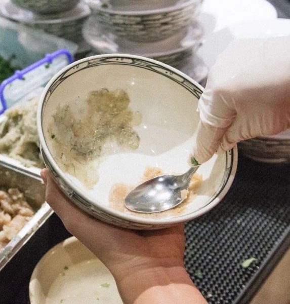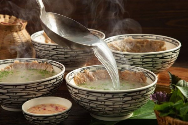 - Lấy một chiếc bát to, phết một lớp mỏng chả tôm và chá cá vào đáy bát. Sau đó rắc thêm hạt tiêu xay, hành lá và đổ nước dùng thật sôi vào.