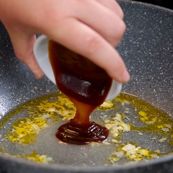- Khi tỏi chín thì cho 50ml nước cốt chanh, 50ml nước lọc, 30gr dầu hào, 1 thìa canh đường, 1/4 thìa cà phê muối, 1/4 thìa cà phê hạt tiêu rồi khuấy đều. Vừa nấu vừa khuấy đến khi hỗn hợp sốt chanh sôi và sánh lại thì tắt bếp.