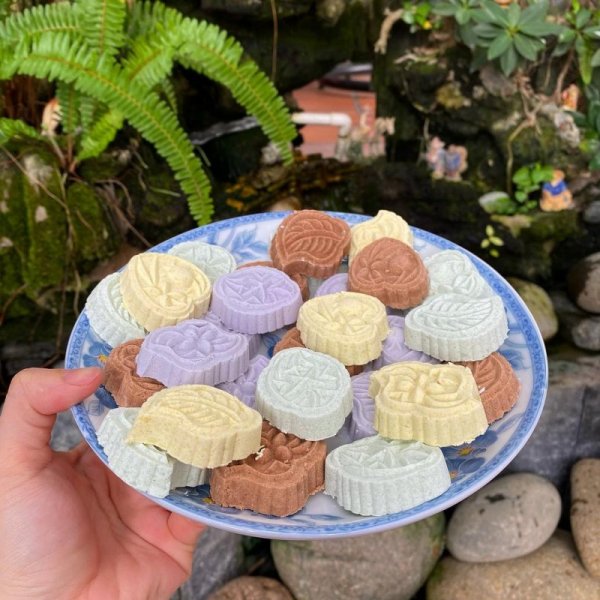 Khi nhuộm màu cho bột, người làm bánh sẽ phải rất tỉ mỉ và cẩn thận để bột thật tơi khi trộn, thế nhưng vẫn phải đủ độ ẩm để khi nén không bị vỡ và cũng phải đủ khô để bánh không bị ướt qúa. Nếu không cẩn thận trong khâu trộn bột, khi lấy bánh ra khỏi khuôn, bạn sẽ có những chiếc bánh bị vỡ hoặc không thành hình đẹp mắt. Sau được nén thật chặt, bánh sẽ được lấy ra và xếp ra đĩa.