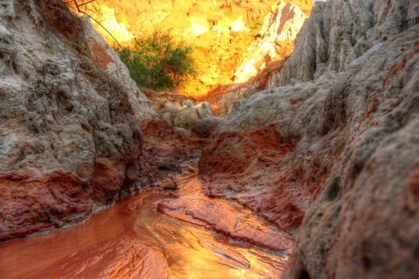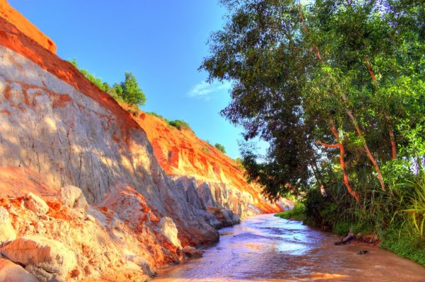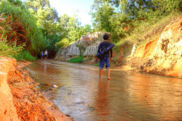 Sang ngày thứ 2 thì tôi xuất phát từ sáng sớm, các điểm tôi đến hôm nay đều nằm xa trung tâm thành phố.Nơi tiếp theo là một sự phát sinh bất ngờ trong chuyến đi, tôi được cô chủ homestay giới thiệu nơi này và hướng dẫn đường đi. Nghe cô chủ nói nơi đây được xem như chốn tiên cảnh giữa lòng sa mạc nắng gió của miền trung. Nên tôi đã quyết định sẽ đi để xem nó như thế nào. Sau hơn 20 phút chạy xe hướng về Mũi Né trên con đường Huỳnh Thúc Kháng thì tôi đã đến nơi. Suối TiênKhi đi đến đây các bạn sẽ gửi xe phía ngoài và sẽ phải đi bộ dọc theo con suối. Những bước chân đầu tiên tôi vẫn chưa ấn tượng lắm vì khung cảnh cũng bình thường. Đi thêm một đoạn sẽ có một người bán nước ở trước hai vòm cây cao vọng xuống tạo thành một cánh cổng tự nhiên. Mọi thứ hoàn toàn mở ra khi tôi bước qua cánh cửa thiên đường đó. Nếu như hôm qua lịch sự mang đến cho tôi sự hoài niệm, thì hôm nay thiên nhiên đã làm cho tôi phải thán phục trước bàn tay tạo hóa. Tôi không thể tin được rằng giữa miền cát và nắng này là được thiên nhiên ưu ái ban tặng cho chốn thần tiên này. Một dòng suối nhỏ mát lạnh và trong vắt chảy róc rách giữa một bên là dãy đồi núi đất đỏ và một bên là rừng cây xanh ngắt.