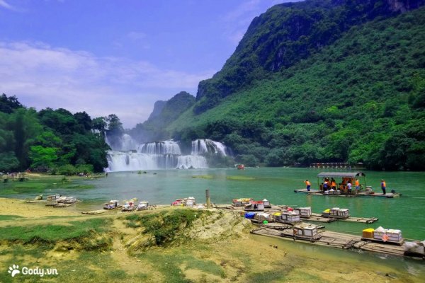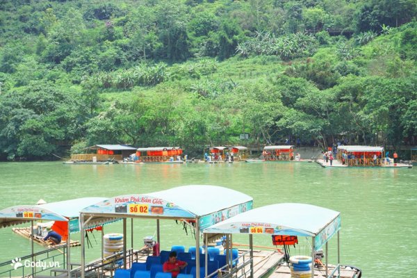 Bên này là Việt Nam, bên kia là Trung Quốc nè Mặc dù dữ dội và ồn ào như thế nhưng nếu nhìn khung cảnh thiên nhiên xung quanh, bạn sẽ thấy nó hiền hòa và thơ mộng đến lạ. Thác nước này có 2 nhánh, nhánh lớn với độ cao thấp, chảy qua từng bậc đá vôi thấp. Nhánh còn lại nhỏ hơn nhưng lại cao hơn, chảy hiền hòa giống như mái tóc của thiếu nữ. Đến gần, những bọt nước rơi xuống rồi bắn tung tóe, có khi bắn lên người bạn. Nhưng lại không hề khó chịu nhé, bởi nguồn nước ở đây rất mát. Vé tham quan Thác Bản Giốc là 40.000/người. Dù không phải là cuối tuần nhưng nơi đây có vẻ được nhiều người lựa chọn picnic, nghỉ mát và vui chơi. Vài nhóm những cậu thanh niên kéo nhau xuống tắm mắt, có vài nhóm thì chọn ngồi trên những chiếc bè nổi để du ngoạn tham quan sông Quây Sơn. Một lời khuyên cho bạn đó là nếu có ý định lên đây, nếu được hãy mang theo chiếc bạt nhỏ, để có thể trải xuống ngồi nghỉ ngơi, thêm chút ít đồ ăn nhẹ nữa thì sẽ tuyệt vời lắm đó.