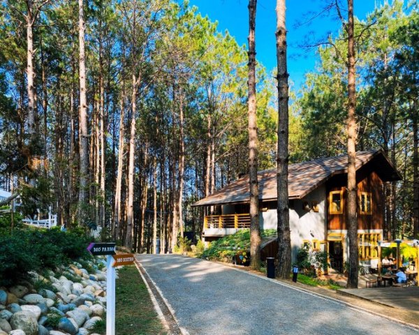 Nếu là một người thích không gian thoáng, hòa mình với thiên nhiên thì có thể chọn vị trí ngồi ngoài trời, bạn sẽ được ngồi giữa rừng thông thơ mộng.