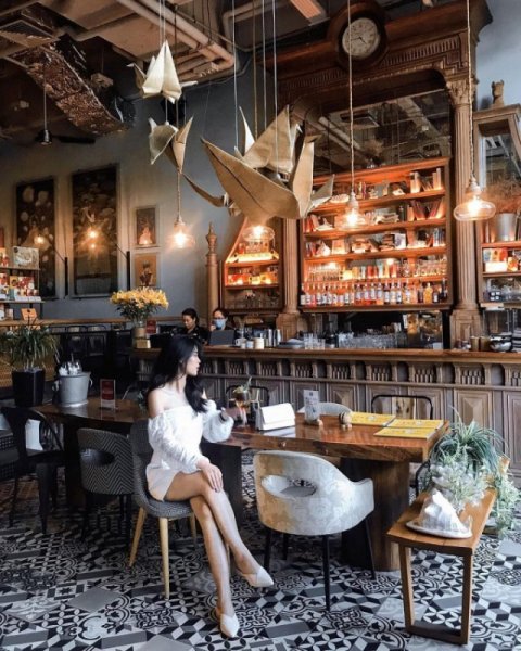 Bầy hạc được treo lửng lơ bên trong quán thực chất là đang “che giấu” những ngọn đèn vàng mang đến không gian lãng mạn, tự do.