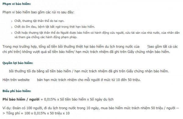 Đối với bảo hiểm du lịch trong nước, hiện tại chưa có bảo hiểm cho hành lý, còn đối với các trường hợp tai nạn, tử vong... mức bồi thường dao động quanh 20 triệu đồng, tuỳ từng trường hợp và mức độ thương vong;