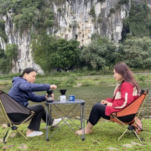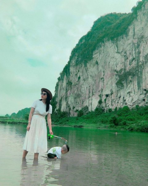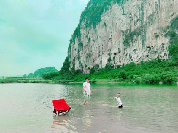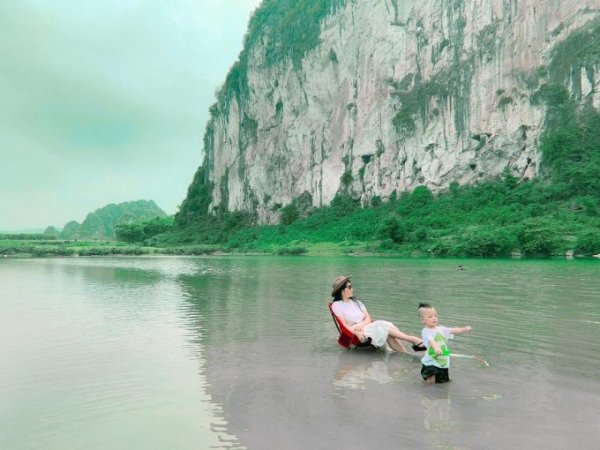 Khi đến đoạn sông này, các bạn có thể kê bàn ghế ngồi ngắm cảnh ở giữa sông. Ưu điểm của nơi đây chính là không gian rất đẹp, cây cối xanh rì, đồi núi chập chùng, nước trong vắt, rất nông vì là đầu nguồn chảy nhẹ và đều. Các bạn nhỏ cũng có thể ra sông ngồi chơi. Dưới sông có nhiều đá, sỏi to nên bố mẹ mang theo nên mang ủng, giày nhựa để con lội sông không bị đau chân.