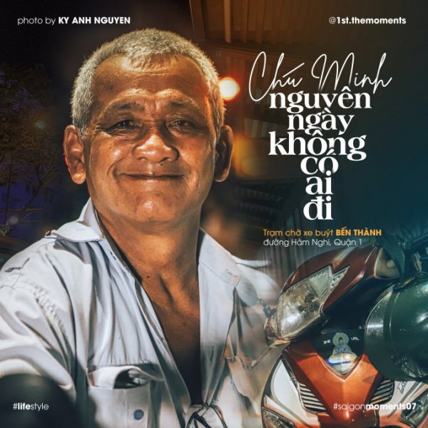 Chú Minh chạy xe ôm tại trạm chờ xe buýt Bến Thành là dự án số 7 được photographer Nguyễn Kỳ Anh gửi đến mọi người. Mặc dù ít người đi và giờ đây tiền kiếm được cũng không đủ trang trải cuộc sống nhưng chú vẫn luôn nở nụ cười trên môi, giúp đỡ mọi người khi được hỏi.