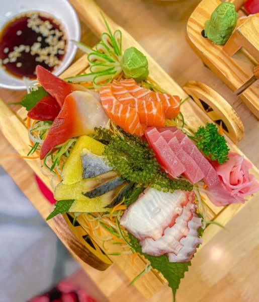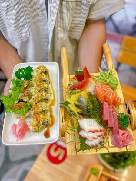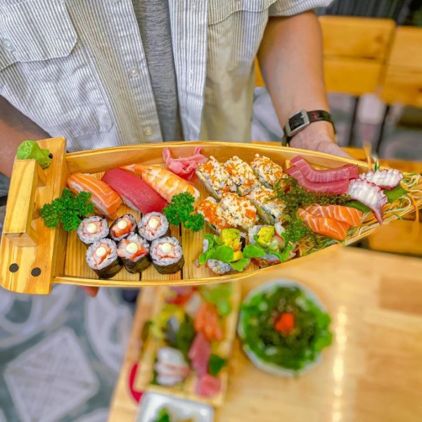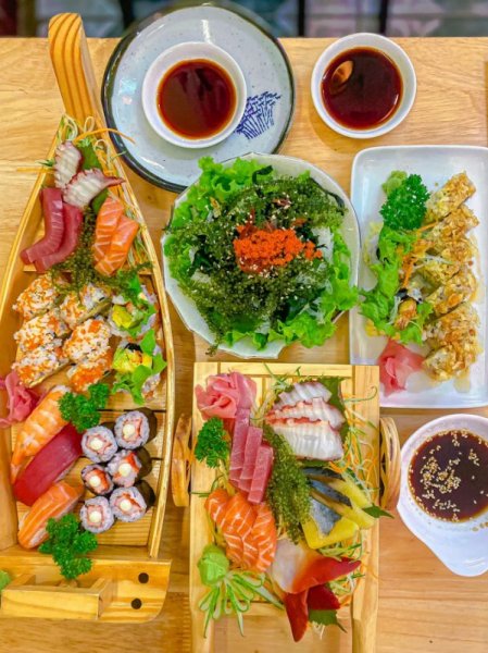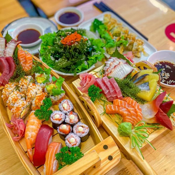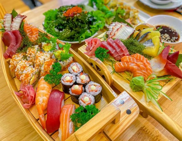 Signature của quán phải kể đến thuyền sashimi và sushi tổng hợp. Chỉ với 198.000 VND, bạn sẽ được thưởng thức cả một thuyền sushi với đủ các thể loại như sushi bơ và thanh cua, maki cali, maki tôm, trứng cá hồi... Các món ăn đều được sử dụng nguyên liệu tươi, kể cả wasabi ăn kèm vô cùng hấp dẫn.