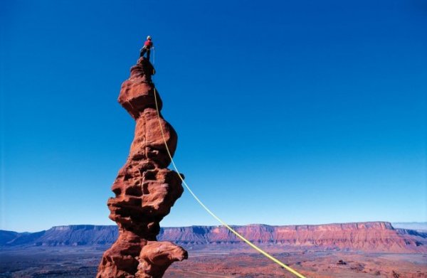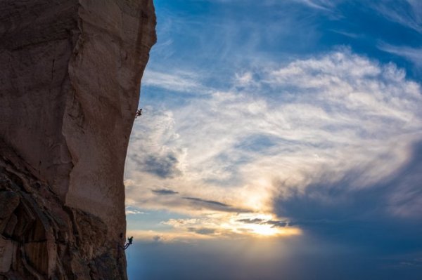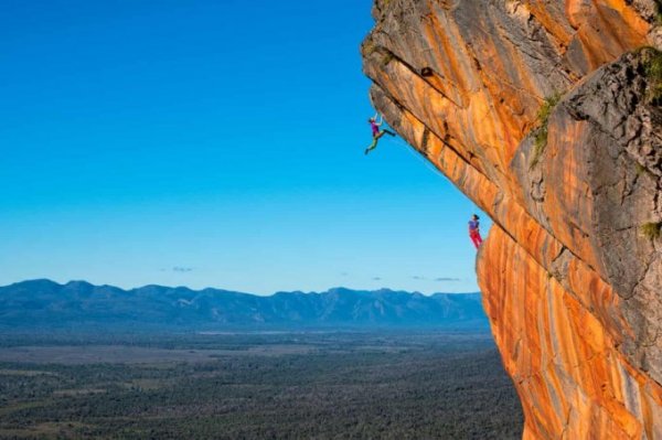 Tại Mỹ, Simon đã chụp lại cảnh tượng Mike Doyle (trên) và Monique Forestier cùng chinh phục bề mặt dựng đứng vách núi của khối đá Smith Rock có hình dạng mặt khỉ tại bang Oregon.