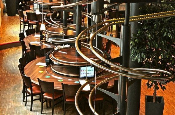 Khi bạn bắt đầu gọi món, “roller coaster” trên bàn sẽ bắt đầu chuyển động. Bằng một số kĩ thuật, món ăn trong những chiếc thố đặc biệt sẽ nhanh chóng "phóng" theo đường xoắn ốc của đường ray.