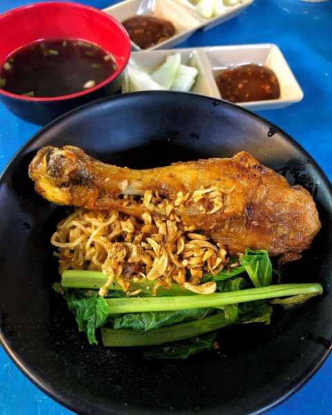 Món mì xanh gà quay sốt trứng muối đầy màu sắc là món “best seller” của tiệm San San. Đùi gà to, chắc thịt được quay vàng giòn thơm, dai ngon. Sợi mì trứng được làm từ rau củ nên có màu xanh tự nhiên trộn cùng sốt trứng muối kèm đùi gà đảm bảo khiến bạn no nê.