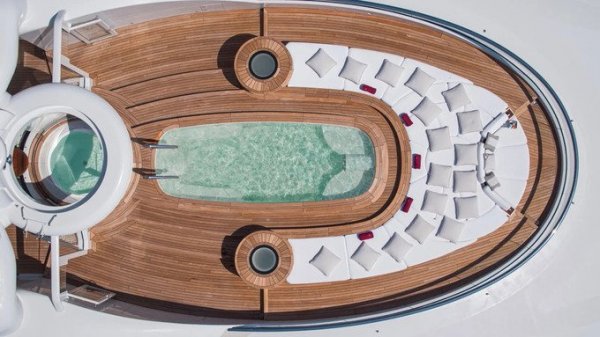 Dưới boong tắm là hồ bơi dài 6 m và bể sục lớn. Bên cạnh là boong tắm nắng và khu vực chăm sóc sức khỏe. Phòng tập thể dục được trang bị technogym, có tầm nhìn toàn cảnh.