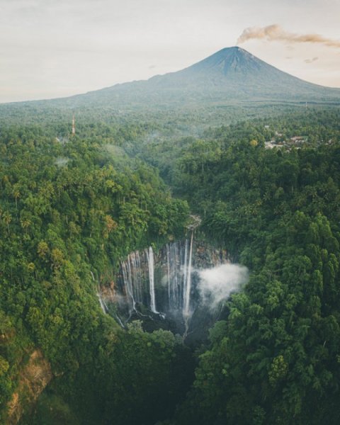 Nhìn vào những tấm hình, bạn sẽ thấy phía sau Tumpak Sewu có một ngọn núi đứng kiêu hãnh và đối xứng. Đó chính là Semura, một ngọn núi lửa vẫn đang hoạt động và hầu như phun trào liên tục. Điều này càng củng cố thêm vẻ đẹp hùng vĩ và tráng lệ của thác nước.
