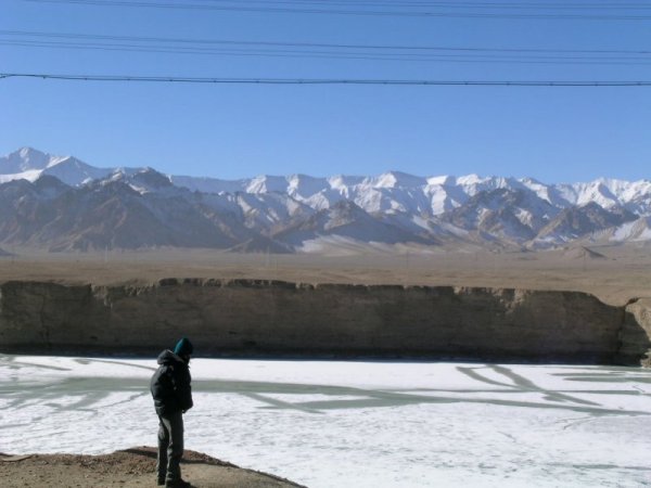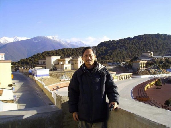 Ông Sơn đứng giữa khung cảnh những ngọn núi tuyết ở Tây Tạng