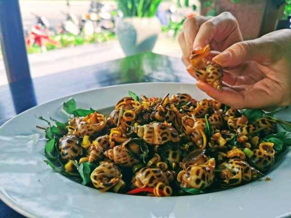 Trong ảnh là đĩa ốc hương được mô tả có lớp thịt thơm, dai dai và hương vị tươi ngon. Loại ốc này có nhiều cách chế biến khác nhau.