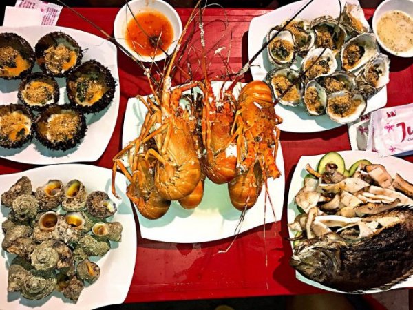 Đi biển đảo, hải sản sẽ là ưu tiên hàng đầu của du khách. Tôm hùm nướng, nhum chưng trứng và cá dò nướng (cũng viết là cá dzò) là những món ăn bạn không nên bỏ qua khi đến Bình Hưng.
