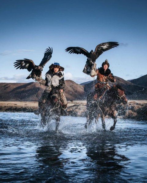 Người Mông Cổ cưỡi ngựa quanh hồ với đại bàng trên một bên tay là hình ảnh mang tính biểu tượng của vùng. Ảnh: @jordhammond