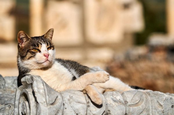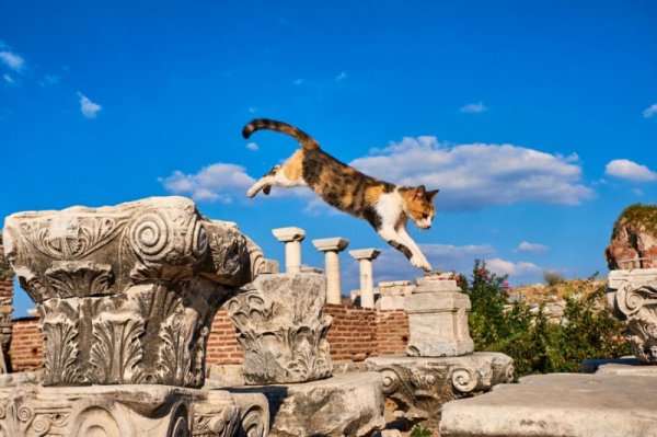 Chú mèo đang chơi đùa tại một khu di tích bỏ hoang có tuổi đời hơn 2.000 năm tại Thổ Nhĩ Kỳ.