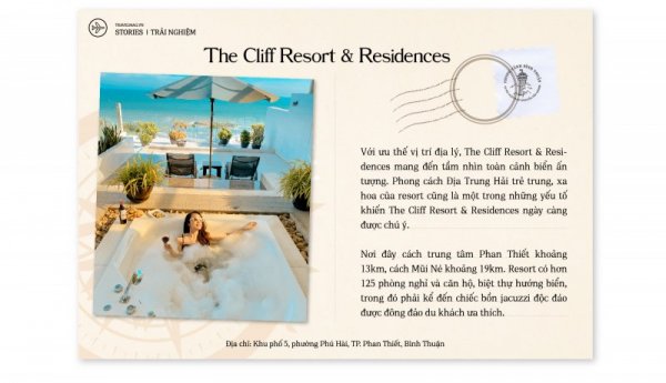Travel blogger Tô Thái Hùng (Tô Đi Đâu) hào hứng kể về những ngày ở The Cliff Resort & Residences: “Mình thích nhất là bồn Jacuzzi ngoài trời. Tận hưởng cảm giác vừa tắm nắng, vừa nhâm nhi một ly cocktail trong chiếc bể ấy thì chao ôi, còn gì tuyệt hơn nữa chứ? Mình đánh giá The Cliff Resort & Residences vừa sang trọng vừa lãng mạn, đẹp chẳng thua gì những shoot phim điện ảnh cả. Bởi càng du lịch nhiều mới thấy Việt Nam mình đẹp lắm, cần chi phải đi Tây đi Tàu”.