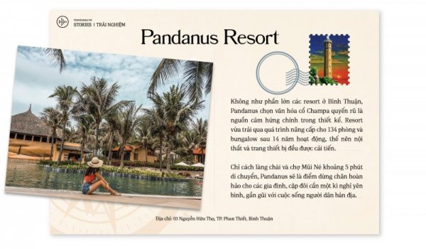 Câu hát "Anh muốn được cùng em về vùng biển vắng, ta sẽ sống những ngày hè yên nắng..." có lẽ phù hợp hơn cả khi được cất lên ở Pandanus Resort. Có thể nói, giữa một Phan Thiết với không ít những resort hoa lệ và náo nhiệt, Pandanus sẽ là một cõi dịu êm, hứa hẹn sẽ làm đầy lại sự yên bình trong tâm hồn khách du từ những điều mộc mạc nhất, đúng với tinh thần "Enriching Oasis" mà resort hướng đến.