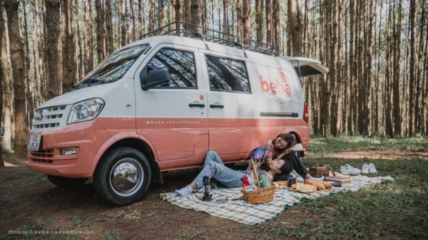 Chiếc coffee van mang tên Béba của vợ chồng Quốc Khánh - Bích Vân (hiện sinh sống tại Đà Lạt) không chỉ là nơi đôi uyên ương kinh doanh mà còn là mái ấm của họ. Chia sẻ với VnExpress, Quốc Khánh và Bích Vân đã bắt đầu bán cà phê lưu động cũng như sinh sống trên chiếc coffee van này từ tháng 3/2021.