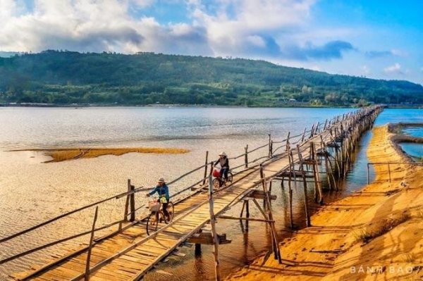 Đây chắc chắn là sẽ là địa điểm yêu thích của những người đam mê sự yên bình và tĩnh lặng. Bên cạnh vẻ đẹp mộc mạc, đơn sơ, cây cầu gỗ còn được bao quanh bởi khung cảnh thiên nhiên đẹp mắt, với mặt nước mênh mông, trong vắt, cùng những rặng phi lao xanh rì.