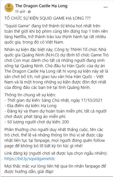 Để trở thành người chơi Squid Game tại Hạ Long vào 17/10 này, có thể đăng ký tại biểu mẫu của bài đăng trên. Nhiều tài khoản cho biết đã đăng kí thành công, nhưng "được chọn hay không thì chưa biết". Đứng trước câu hỏi liệu chơi thua có bị "xử" như trên phim không, BTC của trò chơi hóm hỉnh trả lời "Bị bắn nhưng hem chết được bạn ơi, lên thiên đàng thôi".