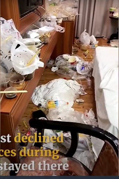 Đoạn video quay tại thành phố Mangshi, tỉnh Vân Nam hôm 24/10 cho thấy, căn phòng bị lấp đầy bởi những hộp thức ăn mang đi, túi ni-lom, thuốc lá và các loại rác khác. Không ngoại lệ, phòng vệ sinh cũng là một cơn ác mộng với rất nhiều thứ không tiện gọi tên.