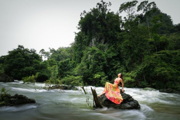 Đầu tiên, tại Hung Trâu - một nơi không dễ để kiếm trên bản đồ, Hoàng My chọn chiếc đầm màu sắc cam của nhà thiết kế Adrian Anh Tuấn. Trên làn nước trong vắt và xanh biếc, xung quanh bao phủ bởi núi non hùng vĩ, Á hậu thả dáng đơn giản nhưng vẫn cuốn hút và toát lên nét đẹp dịu dàng. Không trang điểm cầu kì, không trang phục dạ hội thảm đỏ, Hoàng My vẫn rất tỏa sáng tại “sân khấu” Hung Trâu.