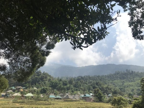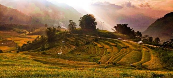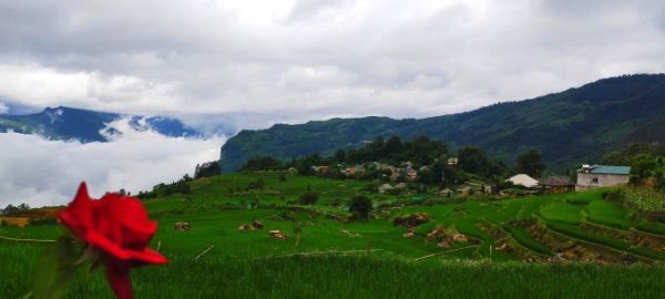 Gần trưa, mây tan nắng chiếu vàng cả thung lũng. Những ngồi nhà trình tường hiện lên như những cây nấm ở giữa đại ngàn. Mùa này, những thửa ruộng bậc thang đang nghỉ ngơi sau mùa vàng bội thu. Đâu đâu cũng có sự hiện diễn của mùi rơm rạ thơm nức mũi. Bên đường những bụi hoa nhỏ li ti màu hồng đang đung đưa theo gió. Tất cả hợp thành một bức tranh phong cảnh hữu tình.