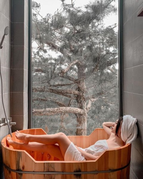 Chỉ cần "chill" trong chiếc bồn tắm gỗ ấm áp, bên ngoài là khung cảnh đồi thông yên ả... cũng đủ mang lại một kì nghỉ ở Đà Lạt khó quên.