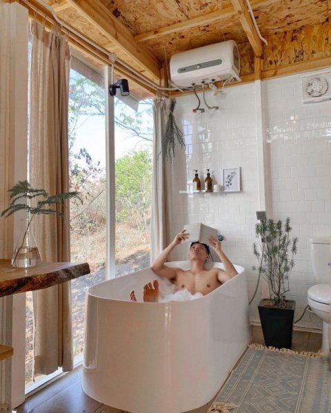 Đặc biệt, ngoài không gian xinh đẹp, view núi rừng thơ mộng, thì nơi này còn khiến các bạn trẻ săn đón bởi sở hữu những chiếc bồn tắm và nhà tắm được thiết kế thẩm mỹ.