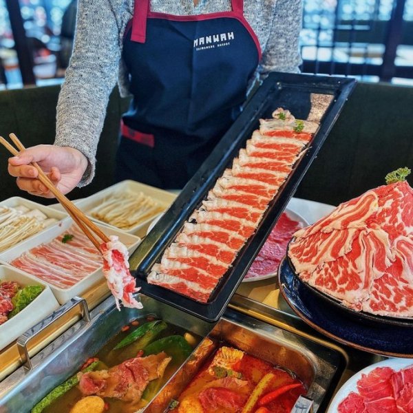 Mức giá 369 nghìn/người (chưa thuế và nước uống) tại nhà hàng Manwah có thể khiến nhiều bạn nhíu mày. Tuy vậy, đây là mức giá dành cho buffet lẩu với 5 vị nước lẩu, hơn 50 món nhúng từ thịt bò - cừu - heo - gà và các loại viên, dimsum và tráng miệng.