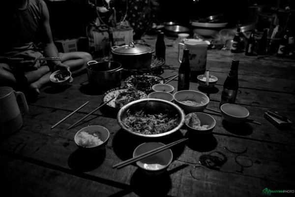 Ông anh thổ địa ở Đồng Nai điện cho mình, xuống đây chơi không anh vừa mới biết một làng chài đẹp lắm trong lòng hồ nè. Không suy nghĩ nhiều mình xách xe và máy ảnh đi ngay, mất tầm hơn 1 tiếng mình đã có mặt ở Bà Đất Homestay, đại bản doanh của ổng. Mấy anh em soạn thêm ít đồ rồi thẳng tiến về hướng Mã Đà.Dọc con đường vào khu vực Mã Đà, chiến khu D là rất nhiều đường nhánh kiểu xương cá, nếu rẽ bên phải thì điểm cuối cùng bao giờ cũng là một làng hoặc một xóm nào đó sát ngay lòng hồ Trị An và một trong những nhánh rẽ ấy dẫn bọn mình tới làng chài suối Tượng. Cảm nhận đầu tiên của mình là rất bất ngờ vì xóm chài rất đông đúc, nhộn nhịp với hàng trăm mái ghe thuyền (họ sống trên thuyền là chính) và cảnh đẹp vùng sông nước.Ghé vào tiệm tạp hoá ngay bến cá, cả đám vào đúng ngay giờ cơm trưa nên được anh chị chủ nhà mời cơm luôn, món cá kho kẹo kẹo bốc mùi thơm lừng được dọn ra, kế bên là nồi lẩu bốc khói với những lát chả cá được làm từ những con cá tươi ngon nhất của lòng hồ, chính tay anh chị làm luôn nên càng đảm bảo. Mấy anh em làm thêm vài lon bia cho xôm tụ, ai cũng cười nói rôm rả, nói chứ chưa thấy bữa ăn dã chiến nào mà ngon đến như vậy luôn. Bọn mình cũng ý tứ gửi lại tiền cơm trước khi đi công việc, hứa là chiều quay lại để nhậu tiếp với anh chị.Khi quay lại tiệm tạp hoá, ngỏ ý muốn được ngủ lại qua đêm thì anh chị chỉ ngay xuống thuyền nói mấy đứa xuống đó mà ngủ, dưới đó chỉ có bà với mấy đứa nhỏ, anh chị thì ngủ trên này coi tiệm luôn. Bữa cơm ngon lành được dọn ra toàn mấy món đặc sản (hình bên dưới nhé), trăng thanh gió mát nên ai cũng rôm rả trò chuyện tới nửa đêm. Đêm đó mưa gió kinh khủng, thuyền cứ dập lên dập xuống, nằm được tí là phải dậy để quây bạt che không cho nước mưa tạt vào, một hồi mưa nhẹ bớt thì ai cũng chìm sâu vào giấc ngủ, một giấc ngủ sâu. 5h sáng anh chủ nhà vào đánh thức mấy anh em dậy rồi lấy thuyền chở cả đám ra đảo gần đó để chụp ảnh bình minh, phải nói sáng ngày hôm đó là một trong những buổi bình minh đẹp nhất trong nhiều chuyến khám phá hồ Trị An của Vinh....