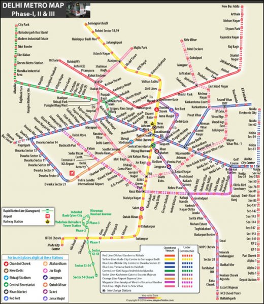1) Tàu điện ngầm (metro) Phương tiện giao thông tiện lợi nhất ở Delhi. Là một trong những mạng lưới tàu điện ngầm lớn nhất thế giới, hệ thống Delhi Metro đã hoàn thành giai đoạn 2, bao gồm chín tuyến với tổng chiều dài 230,18 km và 146 trạm. Hiện hệ thống này vẫn đang được phát triển đến năm 2020, với việc xây dựng nhiều tuyến mới và mở rộng thêm các tuyến cũ. Chín tuyến metro được đưa vào sử dụng bao gồm (như trên bản đồ):– Tuyến số 1 (màu đỏ): Rithala – Dilshad Garden.– Tuyến số 2 (màu vàng): Samaypur Badli – Huda City Centre.– Tuyến số 3 (màu xanh dương): Dwarka Sector 21 – Noida City Centre.– Tuyến số 4 (màu xanh dương): Yamuna Bank – Vaishali.– Tuyến số 5 (màu xanh lá): Kirti Nagar/Inderlok – Mundka.– Tuyến số 6 (màu tím): Kashmere Gate – Escorts Mujesar.– Tuyến số 7 (màu hồng): Majlis Park – South Campus.– Tuyến số 8 (màu đỏ thẫm): Botanical Garden – Kalkaji Mandir.– Tuyến Airport Express (màu cam): Dwarka Sector 21 – New Delhi. Để đi từ sân bay vào trung tâm thành phố, bạn sử dụng tuyến này.Tải map size cỡ lớn tại đây : urbanrail.net/as/in/delhi/delhi.htm
