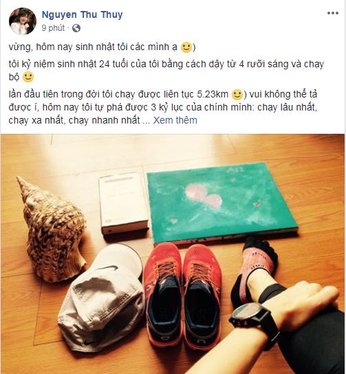 Trong ngày sinh nhật của mình, Hoa hậu Thu Thủy vẫn chăm chỉ tập thể dục: "Vâng, hôm nay sinh nhật tôi các mình ạ. Tôi kỷ niệm sinh nhật 24 tuổi của tôi bằng cách dậy từ 4 rưỡi sáng và chạy bộ. Lần đầu tiên trong đời tôi chạy được liên tục 5.23km, vui không thể tả được í, hôm nay tôi tự phá được 3 kỷ lục của chính mình: chạy lâu nhất, chạy xa nhất, chạy nhanh nhất