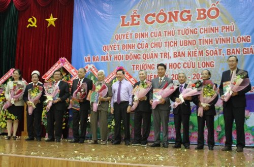 Ra mắt Hội đồng quản trị Trường ĐH Cửu LongTại buổi lễ, Trường ĐH Cửu Long đã Công bố Quyết định của Chủ tịch UBND tỉnh Vĩnh Long về việc công nhận Hội đồng quản trị, Hiệu trưởng Trường ĐH tư thục Cửu Long (nhiệm kỳ 2018 - 2023); công bố Quyết định của Chủ tịch HĐQT về việc bổ nhiệm Phó Hiệu trưởng; Ban Kiểm soát Trường ĐH tư thục Cửu Long và công bố Ban Chấp hành Đảng bộ Trường nhiệm kỳ 2015 - 2020.Trường ĐH Cửu Long là trường ĐH đầu tiên ở Vĩnh Long cũng là trường ĐH dân lập đầu tiên ở ĐBSCL. Trường được thành lập ngày 5/1/2000 theo Quyết định số 04/2000/QĐ-TTg của Thủ tướng chính phủ.