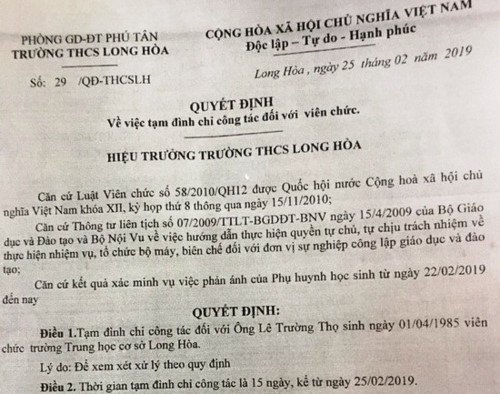 GD&TĐ - Liên qua đến vụ việc thầy giáo bị tố đánh HS vẹo cột sống, sáng 25/2, Trường THCS Long Hòa (huyện Phú Tân, An Giang) đã chính thức có quyết định đình chỉ công tác thầy Lê Trường Thọ.Quyết định được ông Trần Thiện Chơn - Hiệu trưởng Trường THCS Long Hòa ký.Theo căn cứ kết quả xác minh vụ việc phản ánh của phụ huynh học sinh từ ngày 22/2/2019 đến nay, trường quyết định tạm đình chỉ công tác đối với ông Lê Trường Thọ (sinh năm 1985, viên chức Trường THCS Long Hòa) để xem xét xử lý theo quy định.Thời gian tạm đình chỉ công tác là 15 ngày, kể từ ngày 25/2/2019. Được biết, thầy Lê Trường Thọ dạy môn Âm nhạc.