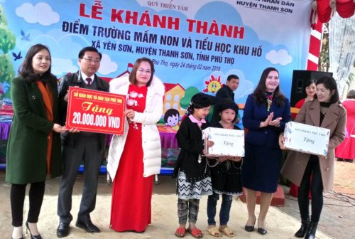 Các đại biểu cắt băng khánh thành hai trườngGD&TĐ - Qua 5 tháng kể từ ngày khởi công, công trình điểm trường Mầm non và Tiểu học khu Hồ, xã Yên Sơn, huyện Thanh Sơn tỉnh Phú Thọ do Quỹ Thiện Tâm tập đoàn Vingroup, Báo điện tử VOV chủ trì phối hợp cùng địa phương xây dựng đã hoàn thành.Đây là một hoạt động ghi dấu với chương trình “Mang tri thức lên vùng cao”do Báo điện tử VOV thực hiện.Trước những khó khăn của thầy và trò nơi đây, Quỹ Thiện Tâm thuộc Tập đoàn Vingroup đã tài trợ kinh xây dựng trường mầm non và tiểu học khu Hồ; UBND huyện Thanh Sơn đầu tư kinh phí san lấp mặt bằng, làm đường bê tông... vào điểm trường, các nhà hảo tâm trang bị thiết bị dạy học, trồng cây xanh trong khuôn viên trường. Tổng giá trị xây dựng công trình là gần 2 tỷ đồng.