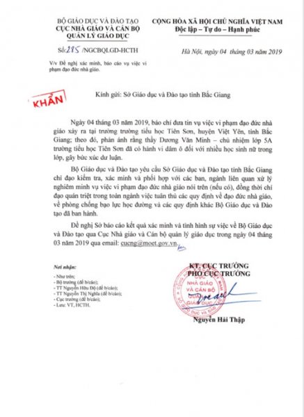 Thừa nhận của giáo viên…Chiều 4/3, Phòng GD&ĐT huyện Việt Yên đã có văn bản báo cáo Chủ tịch UBND huyện Việt Yên và Sở GD&ĐT tỉnh Bắc Giang. Nội dung cho hay, qua xem xét báo cáo của nhà trường và Bản tường trình của ông Dương Trọng M. thì: “Trưa 1/3, ông M. nhận lời mời của phụ huynh HS Tạ Như T. và Trịnh Thị L. đi uống rượu”. Buổi chiều cùng ngày, ông M. lên lớp và những hành động không đúng mực với HS nữ như: Véo mũi, vỗ vai, xoa lưng, vỗ mông HS. Tối 1/3, một số phụ huynh và chính quyền địa phương đã mời ông M. đến đình làng để làm việc. Tại buổi làm việc, ông M. có ký và ghi vào biên bản là “có sờ vào vùng nhạy cảm của HS”.Ngày 2/3, trong Bản tường trình ông M. ghi là đã có những hành động: Véo mũi, véo tai, vỗ vai, vỗ mông HS làm các em sợ. Ngày 2/3, Lãnh đạo Phòng GD&ĐT huyện Việt Yên cùng chính quyền xã Tiên Sơn, BGH Trường TH Tiên Sơn đã phối hợp đến gia đình các HS tiến hành tìm hiểu nắm bắt thông tin theo phản ánh.Ngày 3/3, BGH Trường TH Tiên Sơn đã mời các phụ huynh phản ánh những thông tin trên đến dự họp. Tại buổi làm việc, có 10/11 phụ huynh có liên quan chấp nhận lời xin lỗi của ông M. Tuy nhiên, có 1 phụ huynh dự họp không đồng ý về lời xin lỗi và nhận khuyết điểm của ông M.Ngày 4/3, các cháu HS theo phản ánh của nhà trường đều đến lớp và tham gia hoạt động học tập, giáo dục bình thường. Phòng GD&ĐT huyện Việt Yên chỉ đạo nhà trường tạm đình chỉ việc giảng dạy đối với ông M từ ngày 4/3/2019 đến khi làm rõ sự việc.Để làm rõ sự việc trên, Phòng GD&ĐT huyện Việt Yên đã đề nghị Chủ tịch UBND huyện chỉ đạo Công an huyện cũng như các ngành chức năng điều tra, xác minh làm rõ.Cuối giờ chiều 4/3, Sở GD&ĐT đã có văn bản báo cáo toàn bộ vụ việc nêu trên với Chủ tịch UBND tỉnh Bắc Giang, Cục Nhà giáo và Cán bộ quản lý giáo dục, Bộ GD&ĐT.