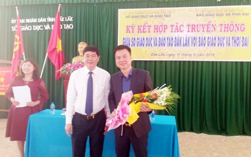 Tổng biên tập Triệu Ngọc Lâm (bên phải) và Giám đốc Sở GD&ĐT Đắk Lắk Phạm Đăng Khoa (bên trái) trao văn bản ký kếtGD&TĐ - Ngày 11/3/2019, tại thành phố Buôn Mê Thuột, Báo Giáo dục & Thời đại đã thực hiện việc ký kết hợp tác truyền thông với Sở Giáo dục & Đào tạo tỉnh Đắk Lắk.Tham dự buổi lễ ký kết, về phía Báo Giáo dục & Thời đại có ông Triệu Ngọc Lâm – Tổng Biên tập Báo cùng đại diện lãnh đạo các phòng, ban chuyên môn của Báo. Về phía Sở Giáo dục & Đào tạo tỉnh Đắk Lắk có ông Phạm Đăng Khoa – Tỉnh ủy viên – Giám đốc Sở Giáo dục & Đào tạo; bà Lê Thị Thanh Xuân – Đại biểu Quốc hội Khóa 14 – Phó Giám đốc Sở; bà Thái Mỹ Bình – Chánh văn phòng Sở…Tại lễ ký kết, ông Phạm Đăng Khoa đã giới thiệu khái quát về hoạt động của ngành Giáo dục tỉnh Đắk Lắk, những khó khăn, thuận lợi, những thành tựu mà ngành Giáo dục Đắk Lắk đã gặt hái được trong thời gian qua. Ông Phạm Đăng Khoa đánh giá cao ý nghĩa việc kí kết và tầm quan trọng của công tác truyền thông.
