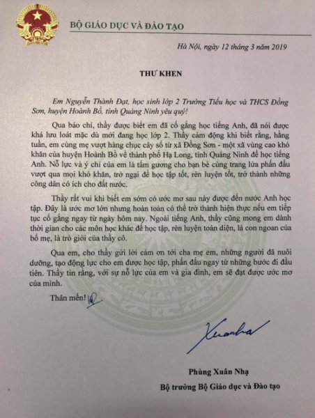 Bức thư Bộ trưởng Phùng Xuân Nhạ gửi cậu học trò Nguyễn Thành ĐạtXưng “thầy” trong bức thư gửi cậu trò nhỏ vùng cao, người đứng đầu ngành Giáo dục viết:“Qua báo chí, thầy được biết em đã cố gắng học tiếng Anh, đã nói được khá lưu loát mặc dù mới đang học lớp 2. Thầy cảm động khi biết rằng, hằng tuần, em cùng mẹ vượt hàng chục cây số từ xã Đồng Sơn - một xã vùng cao khó khăn của huyện Hoành Bồ về thành phố Hạ Long, tỉnh Quảng Ninh để học tiếng Anh.Nỗ lực và ý chí của em là tấm gương cho bạn bè cùng trang lứa phấn đấu vượt qua mọi khó khăn, trở ngại để học tập tốt, rèn luyện tốt, trở thành những công dân có ích cho đất nước.Thầy rất vui khi biết em sớm có ước mơ sau này được đến nước Anh học tập. Đây là ước mơ lớn nhưng hoàn toàn có thể trở thành hiện thực nếu em tiếp tục cố gắng, phấn đấu ngay từ ngày hôm nay. Ngoài tiếng Anh, thầy cũng mong em dành thời gian cho các môn học khác để học tập, rèn luyện toàn diện, là con ngoan của bố mẹ, là trò giỏi của thầy cô”.Trong bức thư, Bộ trưởng Phùng Xuân Nhạ cũng gửi lời cảm ơn tới cha mẹ học sinh Nguyễn Thành Đạt - những người đã nuôi dưỡng, tạo động lực cho em được học tập, phấn đấu ngay từ những bước đi đầu tiên.“Thầy tin rằng, với sự nỗ lực của em và gia đình, em sẽ đạt được ước mơ của mình” – Bộ trưởng gửi gắm trong thư.
