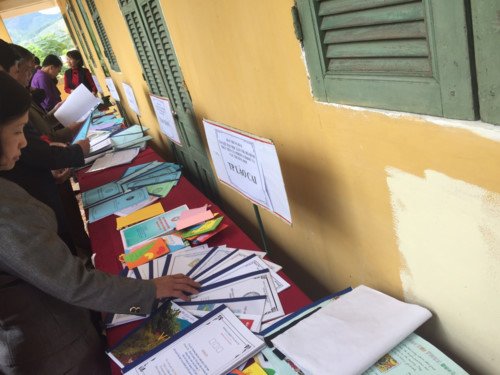 Đại biểu tham quan trưng bày bộ tài liệuÔng Lê Thanh Tùng, Phó Phòng Giáo dục Trung học (Sở GD&ĐT) cho biết: Năm học 2014-2015 tỉnh Lào Cai bắt đầu thực hiển thí điểm