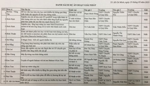 13 dự án được giải Nhất tại Cuộc thi KHKT cấp quốc gia khu vực phía NamGD&TĐ - Ngày 19/3, tại Trường ĐH Tôn Đức Thắng đã diễn ra Lễ tổng kết và trao giải Cuộc thi Khoa học Kỹ thuật (KHKT) cấp quốc gia dành cho học sinh trung học năm 2018-2019 khu vực phía Nam.Phát biểu tại Lễ tổng kết, Thứ trưởng Bộ GD&ĐT Nguyễn Hữu Độ chia sẻ, cuộc thi năm nay Ban chỉ đạo đã lựa chọn các thầy giáo, các nhà khoa học uy tín tại khu vực phía Bắc vào khu vực phía Nam làm ban giám khảo, chấm thi và ngược lại, để nhằm đảm bảo tính khách quan, công bằng, nghiêm túc với cách làm việc rất khoa học.Bên cạnh cuộc thi còn có nhiều hoạt động phù hợp với tâm lý lứa tuổi của học sinh. Cuộc thi đã được sự chỉ đạo sát sao của UBND TP.HCM, sự chuẩn bị chu đáo của đơn vị Sở GD&ĐT TP.HCM, Trường ĐH Tôn Đức Thắng và các đơn vị phối hợp. Đặc biệt sự chuẩn bị công phu, chu đáo của các đoàn tham dự đã tạo nên sự thành công, nghiêm túc của cuộc thi.