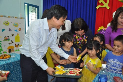 | Bộ trưởng Phùng Xuân Nhạ thăm hỏi trẻ em mẫu giáo. |