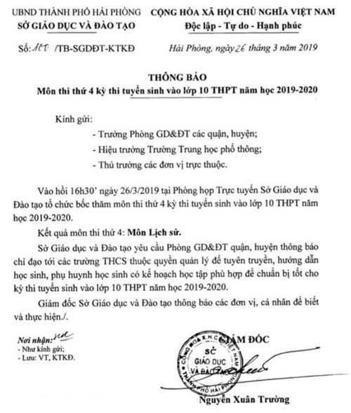 | Thông báo của Sở GD&ĐT công bố môn thi thứ 4 |