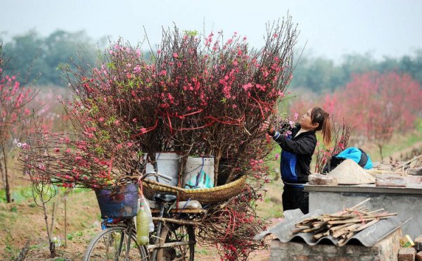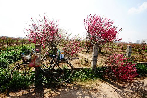 Hoa đào ngày Tết.Anh Nguyễn Văn Minh - nông dân đang sở hữu 3 sào đào với gần 300 gốc ở bãi sông Hồng, thuộc phường Nhật Tân, quận Tây Hồ, Hà Nội, với 10 năm kinh nghiệm chăm sóc đào cho rằng: