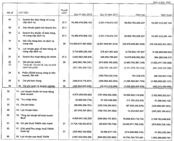 Doanh thu của các dự án BCC không được hợp nhất vào Báo cáo tài chính hợp nhất của Vinhomes; tuy nhiên, lợi nhuận từ các dự án này được ghi nhận là Thu nhập tài chính.Công ty Cổ phần Vinhomes (mã chứng khoán "VHM") đã công bố Báo cáo tài chính hợp nhất quý 4 năm 2018.Tổng doanh thu thuần hợp nhất ghi nhận trong quý 4 năm 2018 là 16.400 tỷ đồng, tăng 47% so với quý 4 năm 2017 - số liệu so sánh năm 2017 được lập trên cơ sở giả định Vinhomes đã có cấu trúc tương tự như kỳ báo cáo tương ứng của năm 2018.Do VinHomes mới được tái cấu trúc thành công ty nòng cốt phụ trách mảng phát triển các dự án VinHomes, VinCity của Tập đoàn Vingroup từ đầu năm 2018 nên việc so sánh với số liệu thực tế của năm 2017 không có nhiều ý nghĩa.Lợi nhuận kế toán trước thuế và lợi nhuận sau thuế của công ty mẹ lần lượt là 4.508 tỷ đồng và 2.347 tỷ đồng.Doanh thu chuyển nhượng bất động sản quý 4 năm 2018 đạt 15.432 tỷ đồng, tăng 40% so với cùng kỳ năm 2017 (số liệu giả định). Doanh thu hoạt động cho thuê bất động sản đầu tư và doanh thu cung cấp dịch vụ quản lý là 550 tỷ đồng. Năm 2017 chưa phát sinh doanh thu này. Thu nhập từ hoạt động hợp tác kinh doanh các dự án bất động sản là 2.533 tỷ đồng.