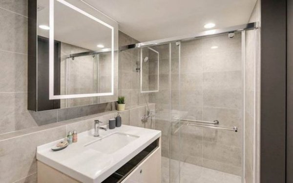 Phòng tắm được bài trí đơn giản gọn gàng.