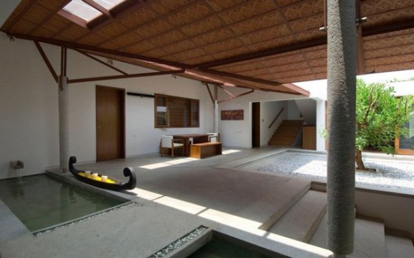 Khu vực giếng trời với tiểu cảnh hồ nước và vườn cây.